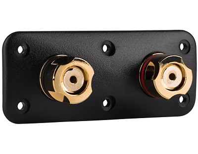 Terminal din Cupru-Teluriu (99,5% Cu) placat cu Aur 24k. Acceptă conectori banană, spade sau cablu Ø4mm. Lungime tijă 23,5mm. Jachetă din polimer ABS. Finisaj negru. Cod culoare roşu şi negru.
