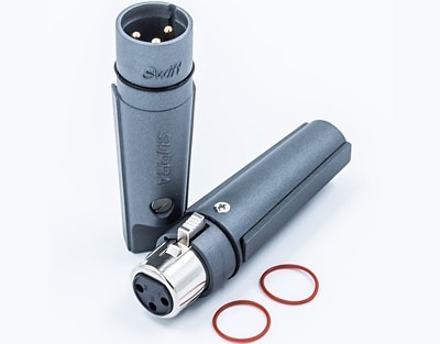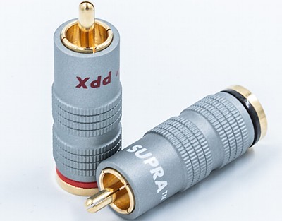 Pin central din Cupru 1100 (conductivitate 102%) şi retur din Cupru-Teluriu (99,5% Cu) placate cu Aur 24k. Asamblare conductor prin lipire cu fludor. Acceptă cablu Ø11,5mm. Lungime totală 41mm. Jachetă Aluminiu anodizat neconductiv. Finisaj negru.