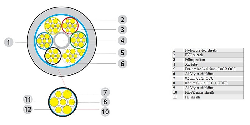 Cablu alcătuit dintr-o combinaţie de 6 grupuri de conductori din aliaj Cupru OCC-Grafen a câte 7 conductori de Ø0,5mm fiecare, din care 4 izolaţi cu polietilenă de înaltă densitate şi 3 neizolaţi. Cele 6 grupuri de conductori sunt împletite elicoidal în jurul unui tub pvc cu aer şi ecranate individual şi în grup cu câte o folie de Aluminiu. Fiecare 3 grupuri totalizează 3,67mm2. Cămaşa exterioară este din pvc albastru deschis cu cămaşă din pet negru.