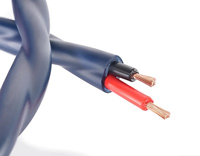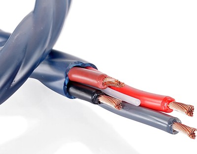 Cablu pentru boxe alcătuit într-o structură răsucită de 2 x 2,5mm2 conductori din Cupru OFC 5N (>99,999%) liţat (50 fire per conductor), fiecare conductor fiind izolat cu polietilenă roşu şi negru. Cămaşa exterioară este din pvc albastru închis.
