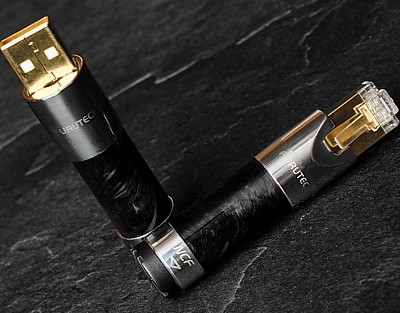 Conectori RJ45 Telegartner CAT8.1 cu contacte placate cu Aur. Cablu din Cupru UP-OCC 100% ecranat cu Carbon, cu filtru proprietar anti-zgomot. 1Gb/s.