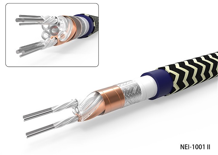 NEOTECH NEI-1002 / NEI-1002 II Cablu cu izolaţie de Teflon microporos şi 2 conductori cu secţiune circulară din Argint UPOCC 5N (single crystal >99,999%) sau aliaj din Argint UPOCC/Aur şi Argint UPOCC (la NEI-1002 II) solid (2 x Ø0,65mm), triplu ecranat (Aluminiu + Mylar + Cupru OFC placat Argint) şi cămaşă exterioară pvc vişiniu închis. Sistem de tuburi de aer pentru reducerea capacităţii parazite. Preţ NEI-1002: 39.90 €/ft!!! |