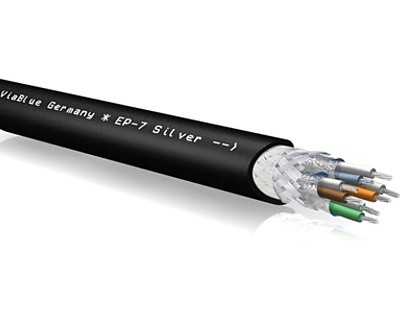 VIABLUE EP-7S Silver CAT7 Cablu din Cupru OFC 5N (>99,999%) solid pentru reţea (instalaţii fixe), ecranat (ecran complex din Cupru OFC placat Argint şi 4 foi de Aluminiu + pet pentru reducerea interferenţelor DECT, cauzate de telefoane mobile, microunde şi surse de alimentare), cu Jitter 0 indiferent de frecvenţă. Cămaşă pvc negru, 8 cabluri dispuse perechi răsucite, fiecare pereche cu izolaţie de Aluminiu + pet.