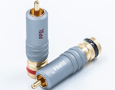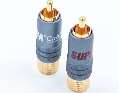 Pin central din Cupru 1100 (conductivitate 102%) şi retur din Cupru-Teluriu (99,5% Cu) placate cu Aur 24k. Asamblare conductor prin lipire cu fludor. Acceptă cablu Ø11,5mm. Lungime totală 41mm. Jachetă Aluminiu anodizat neconductiv. Finisaj negru.
