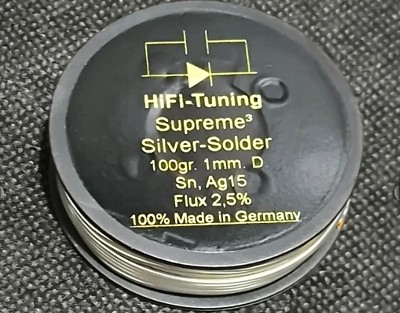 Fludor HiFi-Tuning Supreme3 Fludor de înaltă calitate fără Plumb. Cu 9,5% Argint, 1,8% Cupru şi 0,1% Aur respectiv 15% Argint, 1,8% Cupru şi 0,1% Aur. Adăugarea Aurului accelerează avantajele Argintului şi coboară punctul de topire la 221°C. Diametrul firului de 1mm. Rolă de 100g în ambalaj original sau 10g fără ambalaj. Supreme3 9,5% Ag - 10g. Preţ: 16 €/Buc. Supreme3 15% Ag - 10g. Preţ: 26 €/Buc. |